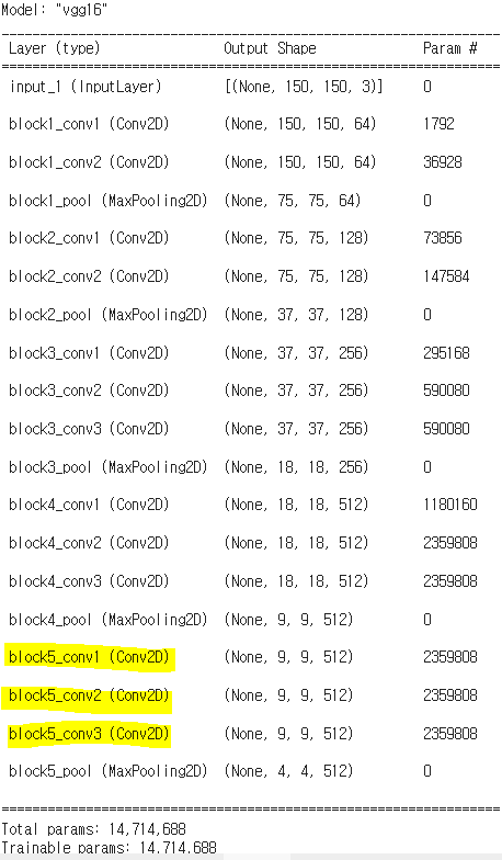 # VGG16(Conv layer) 안에 있는 모든 prams를 동결. Non-trainable params: 0 -> 14,714,688